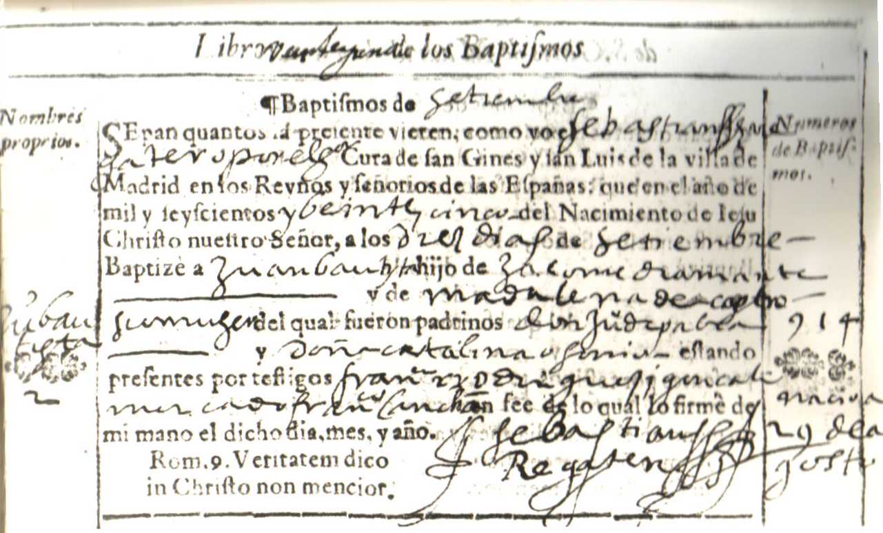 By a curious coincidence the alleged baptismal record occupies a position immediately preceding and on the same page as that of Jácome's second wife, Blanca, dated 5 September 1610, in the registers of San Ginés. Both partidas are entirely fraudulent, as are the banns of the second marriage referred to above.