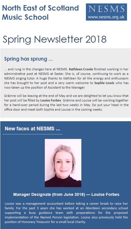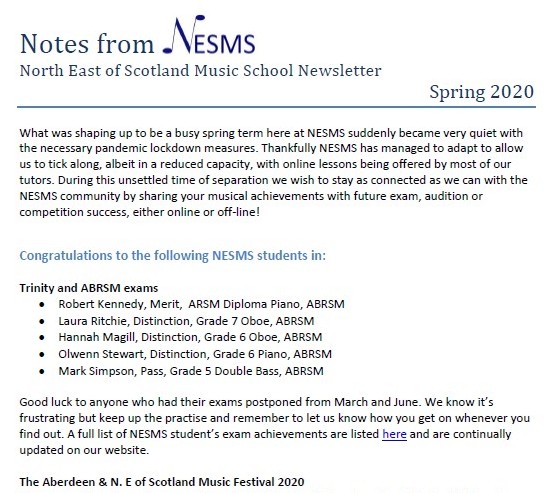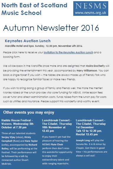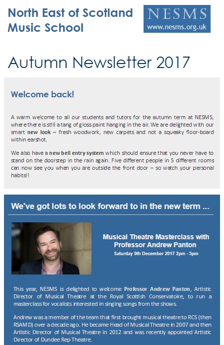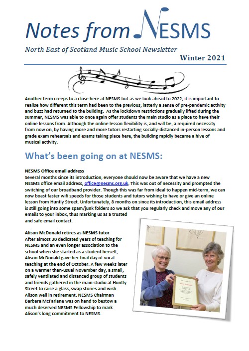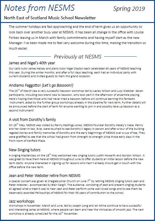 Over four decades NESMS has established a reputation for quality teaching, and has attracted a wide range of fine musicians to Aberdeen including: John Carol Case, Marjorie Blakeston, Neil Mackie, John Shirley Quirk, Sofie-Christine Süssmann, Raimund Herincx and Ruth Black (voice); Donald Hawksworth (organ); David Parkhouse and John Blakely (piano); Peter Mountain and Hugh Bean (violin); Eileen Croxford Parkhouse (cello); Gilbert Biberian (guitar); Paul Anderson (Scottish fiddle); David Nicholson (flute); Simon Milton and Anne Rankin (oboe); Lawrence Gill and Alison Waller (clarinet); Martin Gatt and Janet Bloxwich (bassoon); Ifor James, Lizzie Davis (horn) and Sue Baxendale ; and James Blades (percussion).