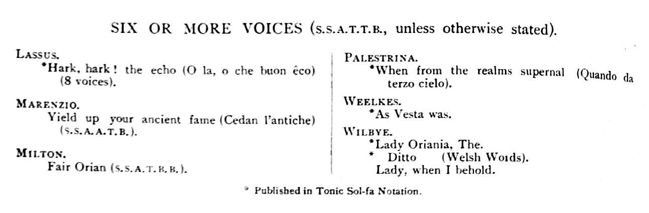 Click on the blue highlighted elements for links to similar or related items [Analytic] Further information: Part 3 of a 'Specimen volume' owned by W.G. Williams (father of RBW) Format:Publisher: Instrumentation: Voice - Sextet (SSATTB) Composer: Song Writer/Librettist: Language(s): Category: